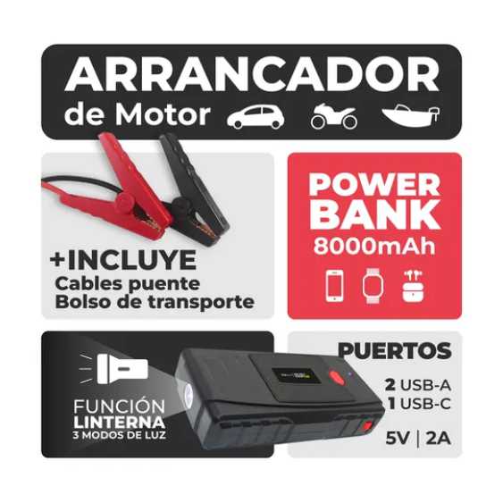 *IMPORTANTE*: Este producto funciona como ARRANCADOR para baterías que NO estén completamente descargadas, en el caso que la misma este completamente descargada, el producto no CARGA la batería.