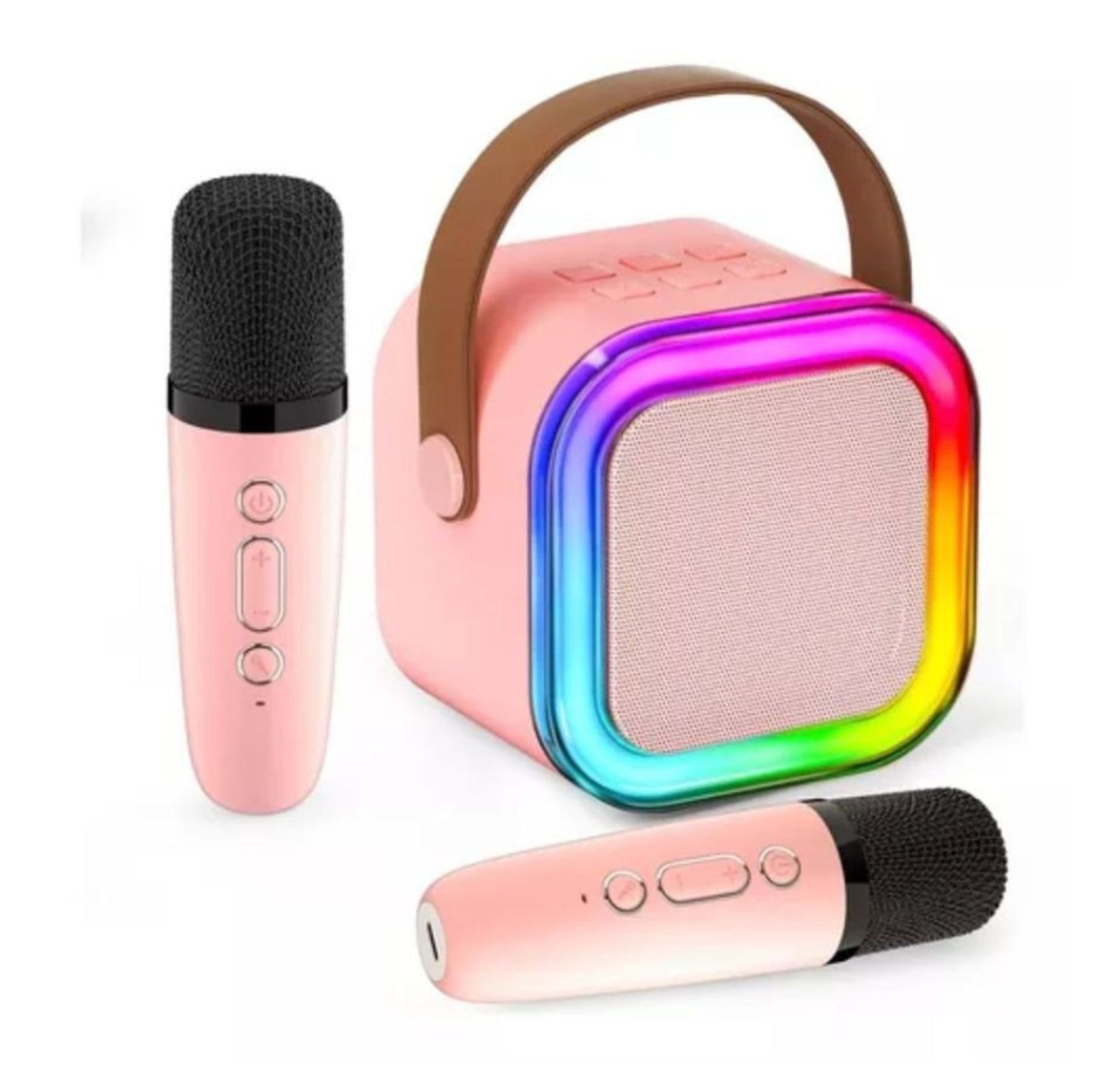 - Diseño Compacto y Colorido: Su elegante color rosa y luces LED RGB crean un ambiente festivo ideal para cualquier ocasión.